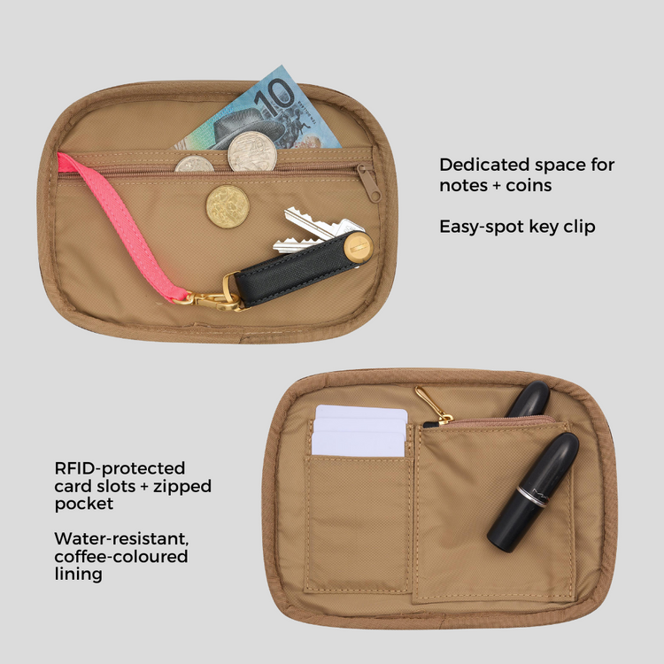 We got sick of 2D pouches that barely fit a phone—so we made one that fits sunnies, keys and wallet essentials too.Gusseted, built-in wallet, 2 straps and a key clip—compact just got clever.