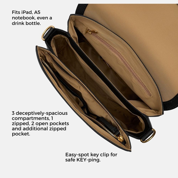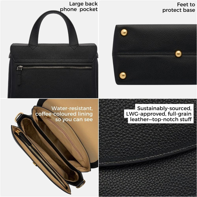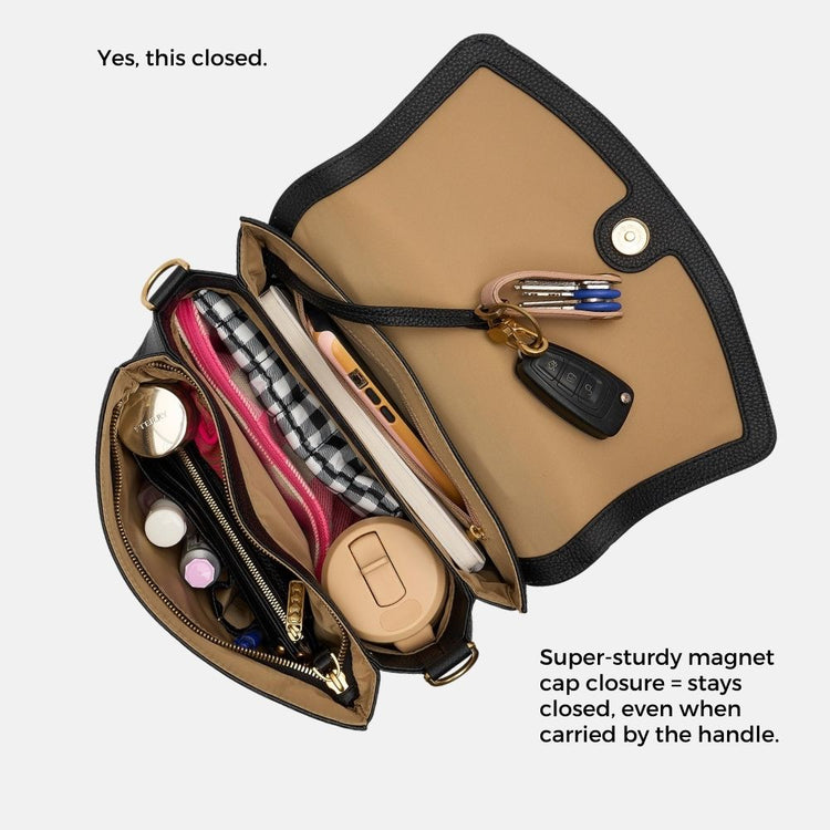 A structured leather crossbody with evening-bag looks, a top handle, adjustable strap, and a magnetic closure that won’t pop open—even when full.