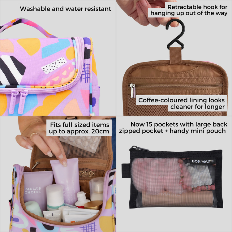 Fully washable, mid-sized wonder that's weirdly roomy. 15 pockets, keeps bottles upright. Tuckaway hook + mesh pouch. Cult favourite with 80,000+ sold.