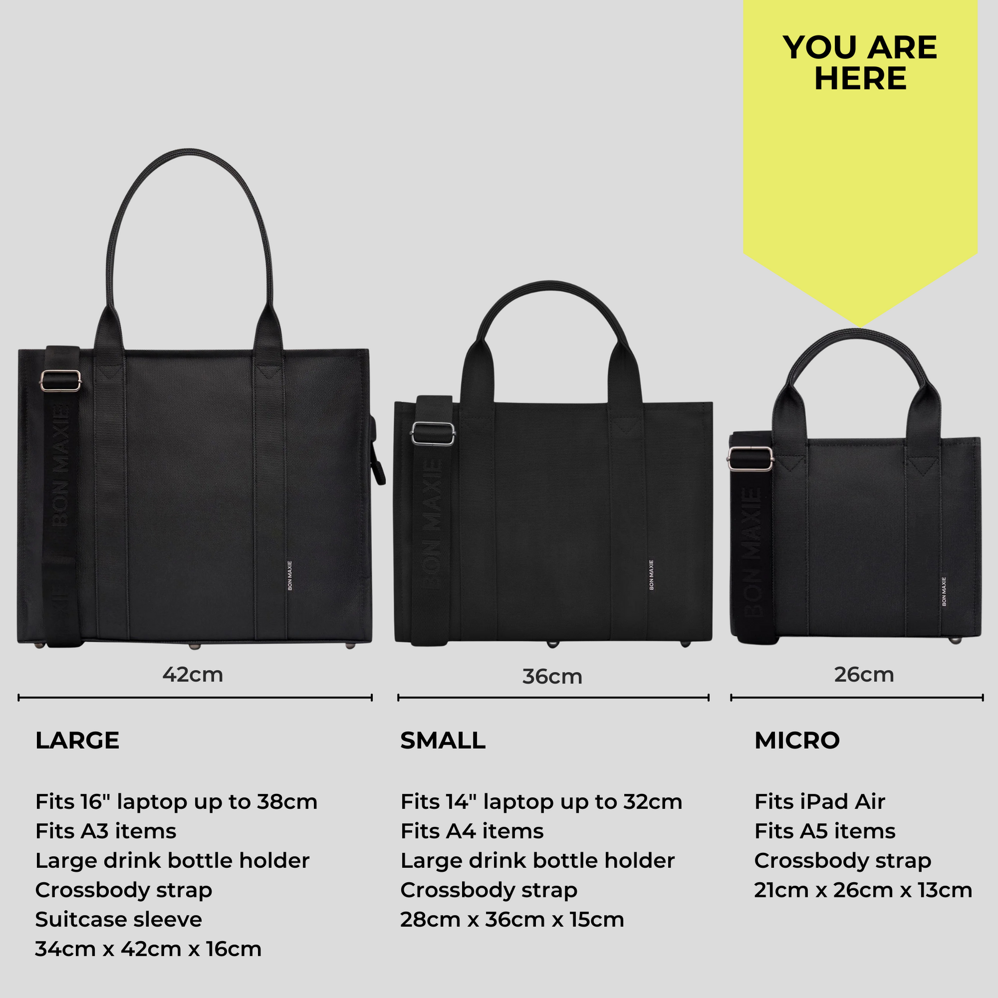 Warning! Do not underestimate: BIG tote energy! Meet our Micro Bon Vivant Structure Tote Bag—the little sister of our best-selling Small and Large Totes. Wipeable, splash-proof, custom-coated exterior. Weirdly roomy, fits your daily essentials (even iPad, drink bottle), structured to keep shape, size-inclusive crossbody strap, easy-spot key clip, 4 internal pockets, coffee-coloured, water-resistant lining, feet on the bottom. So cute, SO handy. Bon Vivant = 'one fond of the full life'. Gunmetal hardware. The smallest of our tote 3 sizes.