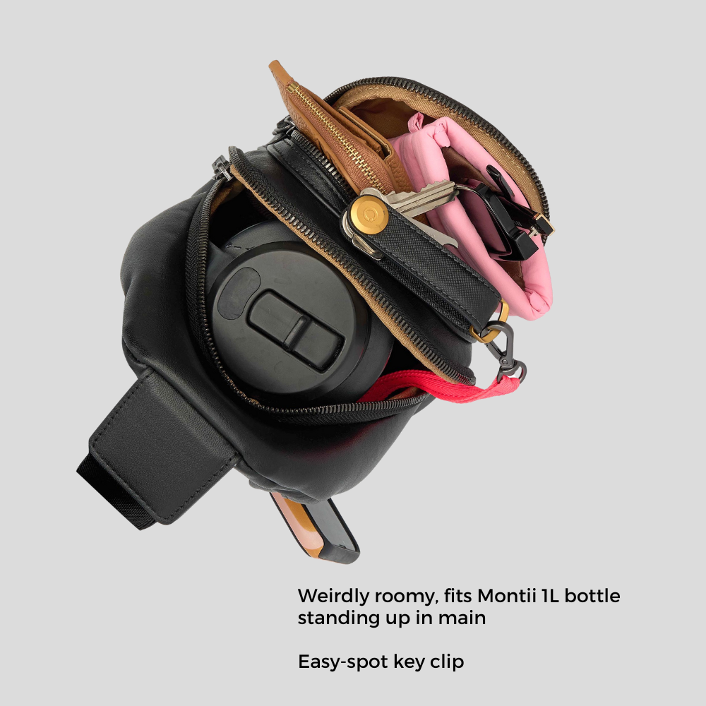 Meet the Multiwear Sling Bag in a luxurious, nappa leather bag and embossed logo—a roomy active-style bag that can be worn across the chest, on your back or as a shoulder bag with adjustable strap up to 140cm. Move the strap fixture to suit your preference. Weirdly roomy, it fits a Montii 1L bottle standing up in the back AND makes it feel comfy on a walk. Water-resistant nylon interior, coffee coloured so you can actually see inside. Easy-spot key clip, hidden back zipped pocket, perfect for stashing phone or other essentials while travelling. 2 front zipped compartments, Main section with mesh open pocket and zipped pocket.