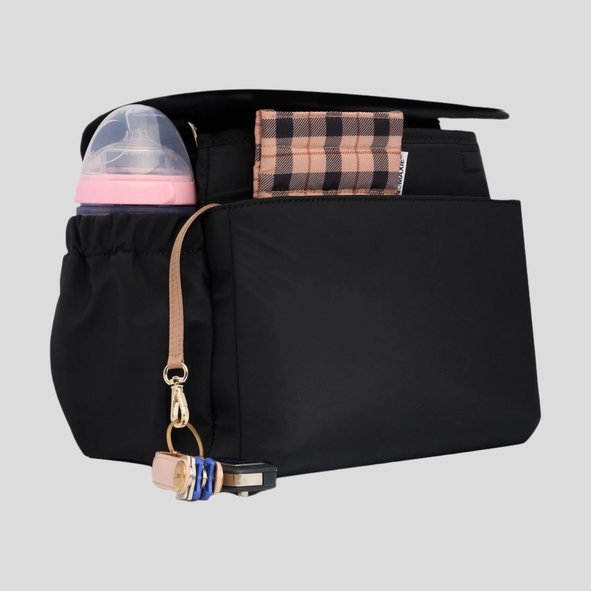 The pram caddy that stays structured, grippy and easy to access—without the chaos. Designed to fix the rummage, slipping straps and saggy bags, with 8 smart compartments, a magnetic lid, easy-access phone and back pockets, and a zipped section with key clip. Fits an iPad and large drink bottle upright, with a wipe-clean, water-resistant lining that hides mess and helps you see inside. Secure, stylish, and built for real-life parenting.