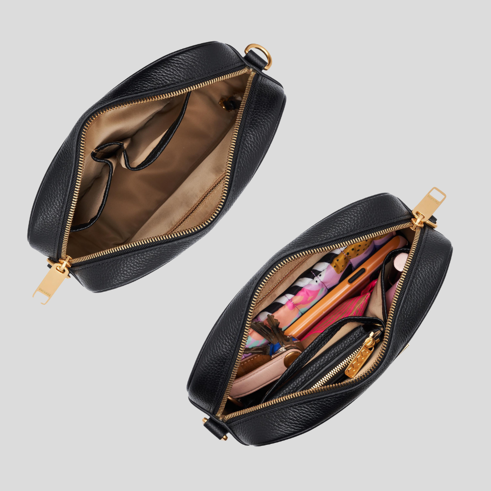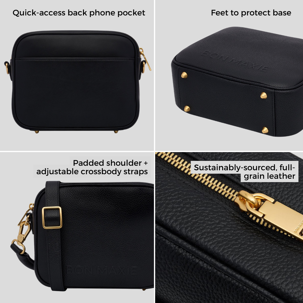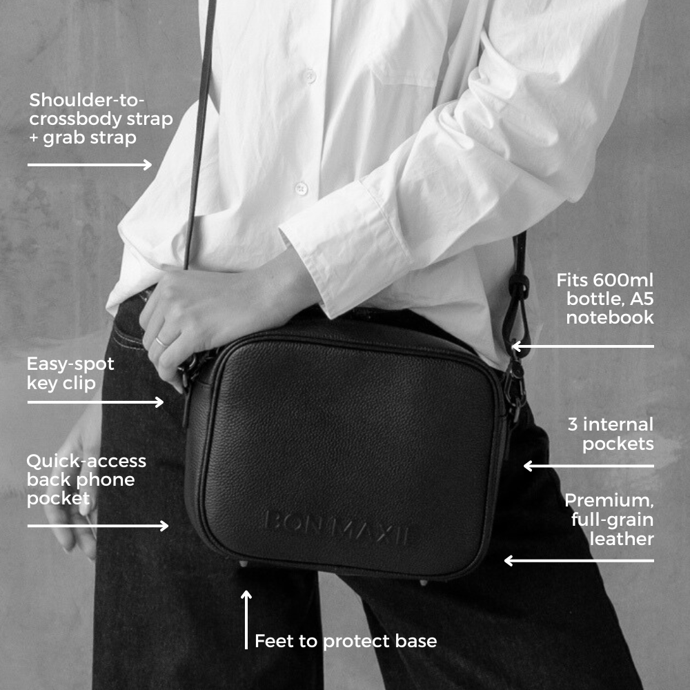 The bag that started our make-bags-functional-again journey. Fits everything you need up to A5 size, 600ml water bottle....and nothing you don't. Sustainably-sourced, premium full-grain (top notch!) leather in black, 2 straps for multiple looks, size-inclusive, wider crossbody strap + padded shoulder strap. Coffee-coloured, water-resistant lining so you can see inside and have a moment to catch any spills. Internal pockets + easy-spot key clip, easy-access back phone pocket that actually fits large phones. Little feet to protect it.