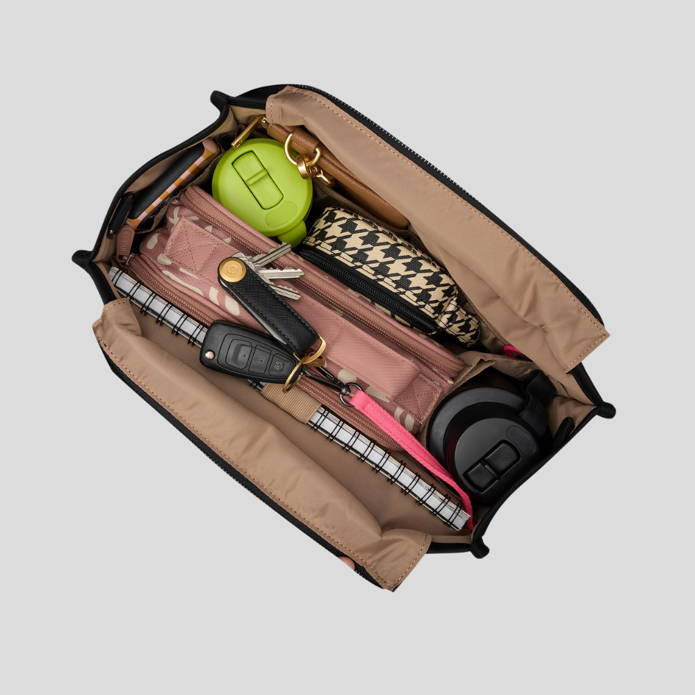 Our solution: The Small Bon Vivant Tote Bag - structured to keep its shape, with a water-resistant and wipeable exterior. With a zipped top for security, plenty of pockets, an easy-spot key clip, drink bottle holder, laptop pocket and additional crossbody strap as well as feet on the bottom to protect it, you'll wonder how you ever managed without your new sidekick.