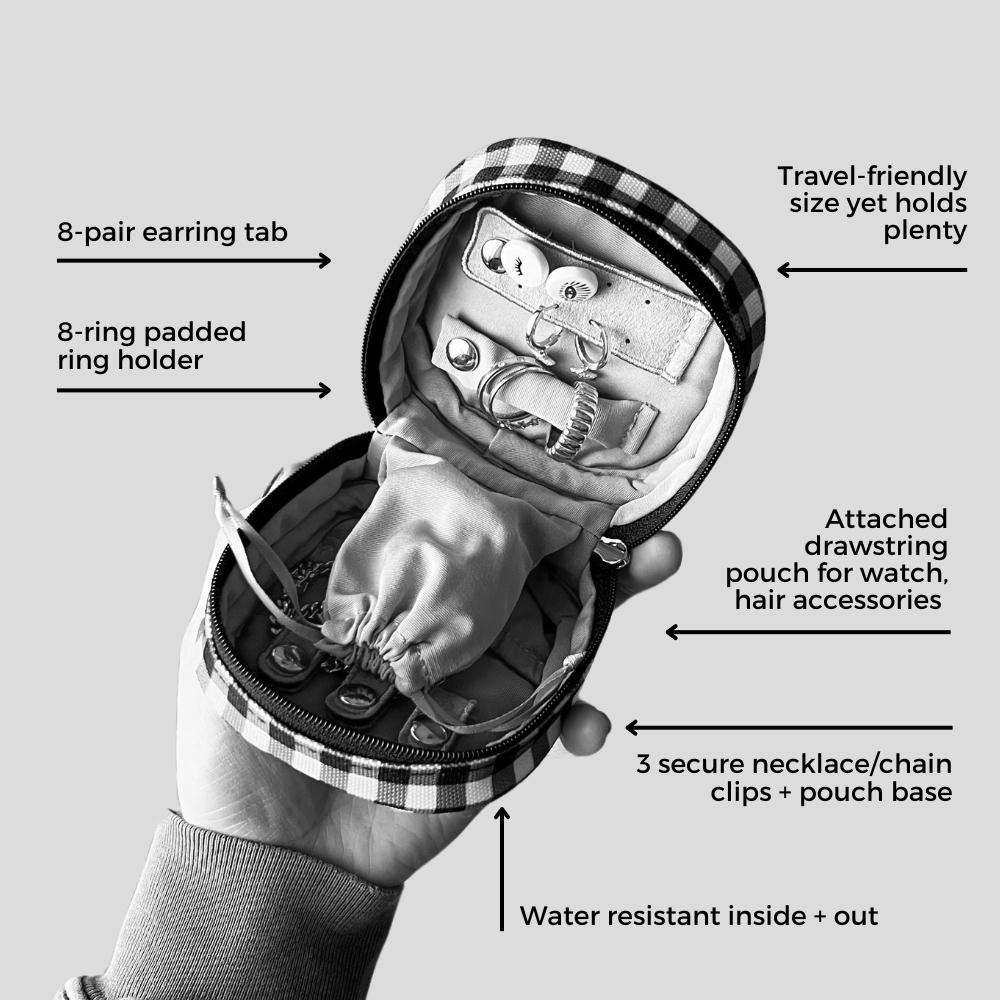 Tiny but tidy—our compact Travel Jewellery Case keeps your earrings, rings, necklaces, hair accessories jewellery in check with clever stud compartments, earring/ring sections, soft protection and zero tangles—whether you’re gym-ing, jetting or just getting through Monday. Weirdly roomy, water resistant inside and out, matches our Toiletry Bag range.